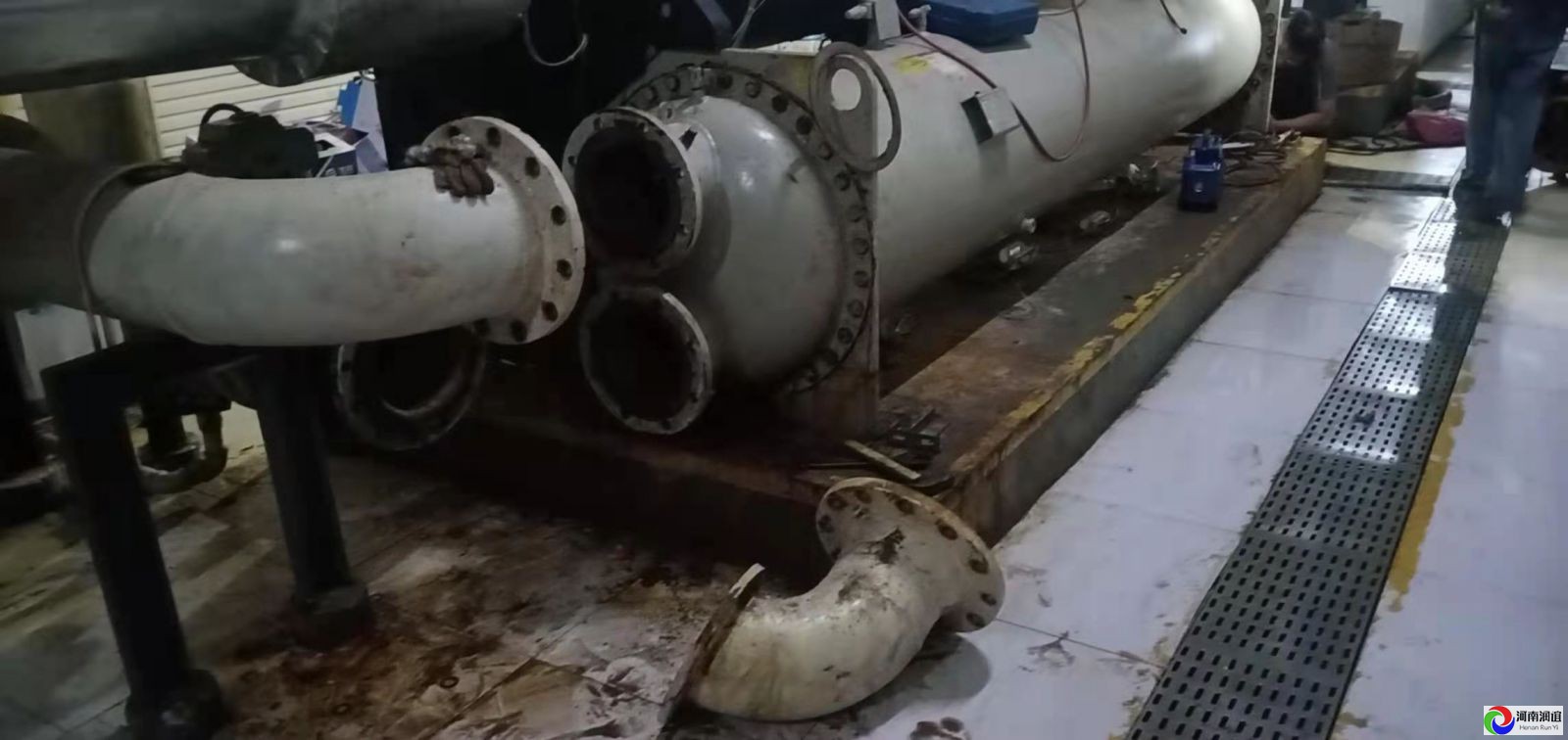 河南鄭州高新區(qū)麥克維爾離心機(jī)組進(jìn)水維修漏點(diǎn),處理系統(tǒng)水分及雜物。